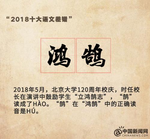 图片来源:中国新闻网微博 评选有哪些原则? 几乎每次“十大语文差错”公布后,都有读者好奇评选原则是什么。黄安靖说,主要把握以下三个主要原则。 “第一是典型性。收集语文运用中使用频率高、出错频率高的典型差错。如‘不知所终’误为‘不知所踪’、‘青睐’误为‘亲睐’等等。”黄安靖说。 第二就是要看“新闻性”。《咬文嚼字》会重点关注重大新闻、热点事件报道中出现的差错,以及名人偶像所犯的差错。如“鸿鹄”的“鹄”误读为hào、“寂寂无名”误为“籍籍无名”等等,就出于名人或热点事件。