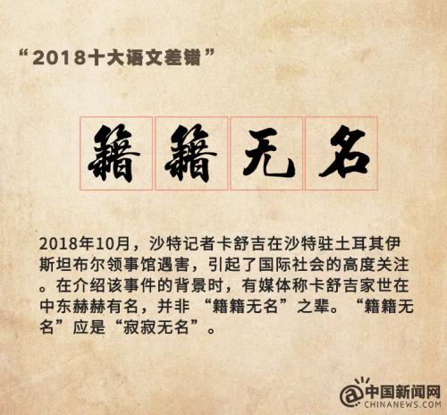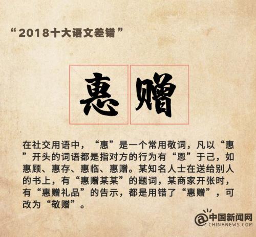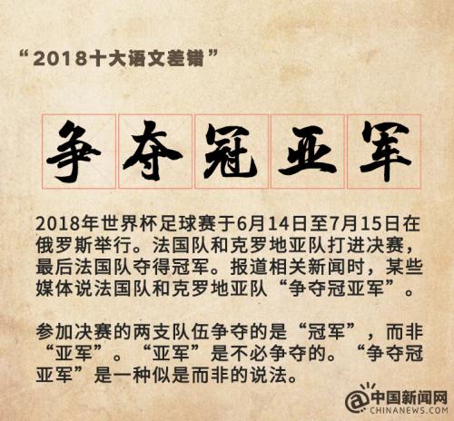 图片来源:中国新闻网微博 收集完素材后,就要进行条目整理工作。《咬文嚼字》编辑部对采集到的条目进行筛选、查证,删除重复的及不成立的,整理出差错初选条目100条。 之后便是专家审核。黄安靖表示,他们成立了专门的专家审核小组。11月底还专门召开专家讨论会议,对初选条目进行逐一审核。通过“投票”方式,形成差错备选条目15条。 “然后把15条差错备选条目发给遍布全国包括大学教授、媒体记者、中小学教师、大中学生、文秘人员在内的100位特定人士,征求他们的意见。”黄安靖表示,编辑部会召开会议,对反馈意见进行审定,最后从15条选出10条,形成定稿。 为啥要发布年度“十大语文差错”? 细数起来,“十大语文差错”的发布已有十多年时间。黄安靖说,从2006年开始,《咬文嚼字》每年发布年度“十大语文差错”,至2018年,已连续发布了13次。 而且,《咬文嚼字》发布年度“十大语文差错”,重点关注热点事件、重大新闻报道以及名人偶像所犯的差错。黄安靖说,如今年的“十大差错”就涉及 “范冰冰逃税”“沙特记者遇害”以及 “世界杯赛事”等热点新闻。