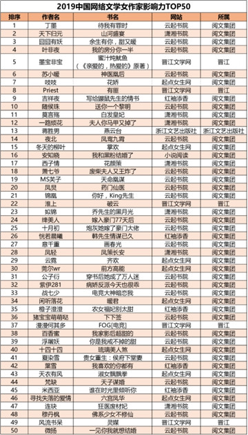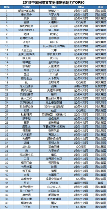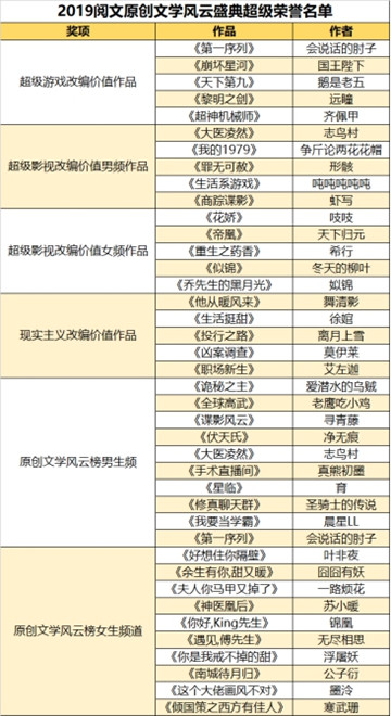 数据来源:速途研究院“2019原创文学白金作家及大神作家”榜单 网络作者年轻化的趋势,从《中国网络文学蓝皮书(2018)》发布的数据中,能够得到有力的例证。在2018——2019年度阅文集团签约作家中,85、90、95占主体,为74.48%,其中90后占比最大,为29.9%。尽管00后作家的数量占比相对较少,但增长幅度则最大,同比去年增长113.04%,其次是95后,同比增长40.26%。在2018——2019年度实名认证的新申请作者中, 95后占74%,90后占13%。数据可见,00后的作者数量增长迅速,我们看到越来越多的年轻人愿意加入写作行列,呈现出可喜的趋势。网络时代的“文学少年”正在崛起,成为未来的文学创作的人才资源。 截至2019年10月,阅文集团签约原创作家中,男性与女性的比例为51%、49%,呈现出均衡态势。从网络作家地域分布上看,签约作家数量也较为均衡,四川、江苏、山东、河南、广东五省位列作者数量前五名,海南、宁夏、青海、西藏和香港特别行政区这些相对偏远的地区也有占比不高、但数量不少的网络作者。网络文学的创作队伍,不仅来自一二线大城市,也有来自祖国最东、最南、最西、最北的省份,形成了蔚为壮观的创作辐射区。不同地域的作者,带有明显的地域文化特征,例如东北方言梗,丰富了创作内容,为作品赋予了鲜明的个性特征。同时,作者中高知比例有所上升,例如医生、博士后、科学家等并不鲜见。 第二节 内容为王——人性化与社会化思考 网络文学写什么,在作者、粉丝、评论家的互相影响又相互制衡的过程中,不断发展变化。网络文学发展到今天,内容为王已经成为不争的事实,网络文学必须走精品化道路也成为业界共识。在政府倡导、网站规制以及作者自律的共同作用下,作品内容的主流化倾向明显。网络作者越来越清醒地意识到,不能仅仅关注市场利益,越来越多的作者在价值导向、人物塑造、情节设计上都呈现出积极向上的一面,文化自觉与文化自信进一步增强。 作者写什么,与其成长的社会背景以及当下的社会文化不无关系。在90、00后的成长背景中,他们经历更多、见识更广,也更包容。他们一边说“佛系”,一边又积极愉悦生活、全力以赴做事。他们的作品中呈现出关注日常、更接地气的整体风格,个体写作者与社会环境的关联度越发紧密。 《手术直播间》的作者真熊初墨,在现实生活中是一位医生。他凭借积累多年的专业知识与经验,以幽默的话语表达方式,塑造了一位医术和医德皆高的男主角。这样的医生,值得每一个人尊敬。也正是凭借作者自身的知识储备,小说没有因为大量的专业名词扑街或是产生阅读障碍,反而以其流畅自然的日常风成为爆款网文。海底漫步者的《绝对一番》,是关于日本都市生活的故事,虽然是海外题材,但仍凭借日常文风格,成为赢得大众关注的惊艳之作。巫马行的《我真没想出名啊》是一部引领娱乐题材“幕后”风潮的作品,也成为本年度都市娱乐题材中的黑马。 此外,《长城守卫者》、《新养老时代》、《匠心》等作品,也都从不同角度聚焦社会生活,是年度值得关注的好内容作品。无论是爆红还是黑马,他们的成功都基于作品中对人性化与社会化的深度思考与充分展现,也是基于粉丝对作品优质内容的接受和肯定。 第三节 谁是赢家——新生力量快速上升 时代的快速发展,使得网文类型和内容更新迭代速度不断加快,类型多元化以及边界不断扩展,作品更倾向关注时代、关注社会、关注民生。内容精品化和题材多样化趋势日渐明显,呈现出网文未来发展的方向,与此同时,新生力量快速上升,“成神通道”日益完善。 创新、创意改变的不仅是网文类型和内容,也正在改变作者、粉丝以及他们之间的关系。如阅文集团的作家培育制度以及作家“明星化”战略、线上与线下的互动交流,让作者与读者、作品角色与粉丝之间不再只是虚拟的存在,粉丝的参与和介入程度更高,作者对市场和用户的喜好了解更精准。作者通过创新写作方式、增减内容元素等方法,创作读者更受欢迎的作品。在涌现出的创意写作新潮中,具有一定的科学逻辑和常识,以及富有创意的内容,是网文制胜的不二法宝。 2019年,阅文“大神们”屡创美谈。由于“成神通道”的完善,“一书封神”竟也成为网文作家的常态。十年前,一位网文作家要积累大神般的知名度,至少需要四五年时间。近几年,凭借一本书登顶的作家越来越常见。2019年新晋大神中,我会修空调于2018年6月在起点开始连载《我有一座冒险屋》,从开始连载到引爆网文圈,仅用半年时间,狂揽100万粉丝,仅起点读书平台就有1.2亿读者点击,数十万读者评论。 90后作家老鹰吃小鸡凭借他的第二部作品《全球高武》,迅速成为“百日霸榜畅销王者”,该书上架后连续100天占据起点销售榜第一的位置,上架第三个月就冲入中国原创文学风云榜月票榜总榜前十,并长期保持在TOP3,超越众多新老“大神”。 青衫取醉的《亏成首富从游戏开始》,是一部引领游戏小说新风潮的反套路作品,上架24小时打破起点游戏品类首订纪录,上架当月冲上游戏品类月票榜第二,游戏品类畅销榜前三,用戏剧性的反转效果横扫各大新书榜单。机器人瓦力的《瘟疫医生》,开创了现代医学对抗神秘力量的网文新视角,成为2019悬疑类型的创新之作。 女频作家吉祥夜在谈到她的转变时说,创作题材和素材正在慢慢落地,越来越反映现