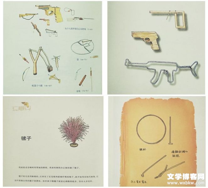 这本书专门介绍了五、六十年代的所谓玩具,引起了我的共鸣。小时候都爱玩,但是玩具好一些的买不起,于是社会上产生了许多自制的土玩具,因而开发了孩子们的对手能力。女孩子们大多喜欢跳皮筋、砍包(一种用布缝制内装植物种子的三角布包)、玩羊拐(一种羊的骨关节)、跳房子(跳格子)、踢毽子等。而男孩子玩的内容相对就多了许多,比如拍三角(用烟盒叠成三角在地上拍)、吹洋画、推铁环、歘(读音为chua)瓷片、歘冰棍棍儿、抽尜尜(读音为gaga ,或称为陀螺,也有叫抽汉奸的)、玩打仗或打弹弓。说起玩打仗,这是男孩子的最爱,当时自己动手制作了各种刀枪剑戟,记得我当时也用木棍削制了很多幼稚的刀枪……