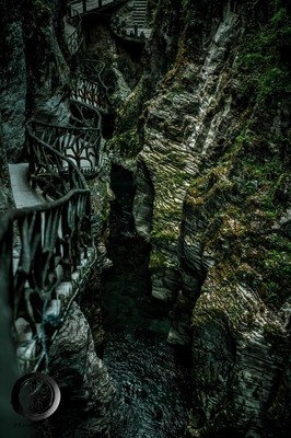 有一段在维修,工人们弄得栈道都在震动。我过时,顶上灰都落到了身上。我的心很紧张,看向栈道路面,有些地方有穿孔,看到下面的万丈深渊,只觉一阵眩晕。我只希望尽快走到有安全感的地方。山顶上有几步能脚踏实地,接着又是无穷无尽的悬崖栈道。就这样走了约1个半小时,才下到距峡谷底部约30米的地方,这段较平,平时,我也是不敢走的,此时,我紧张的心却安定了不少,能朝下看了。谷底有一股清泉在石床上奔涌,两边的岩石有些特色,有点像清江古河床的那段,但裸露岩石更高,河床更狭窄,激流在沟底轰鸣。